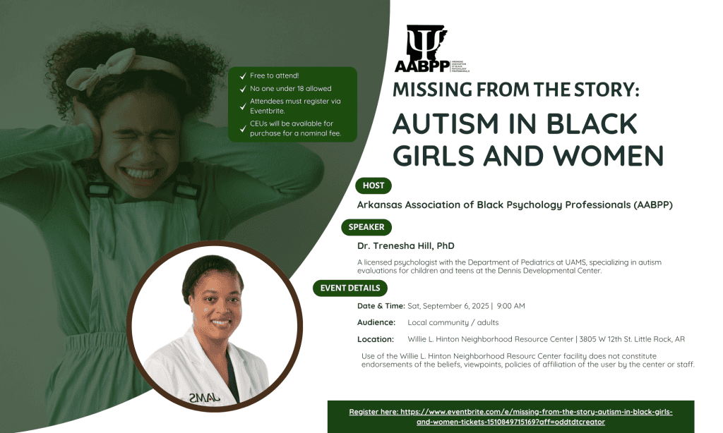 Join the Arkansas Association of Black Psychology Professionals (AABPP) for a powerful community event exploring the underrecognized experiences of Black girls and women with autism.